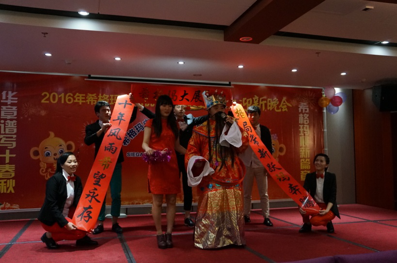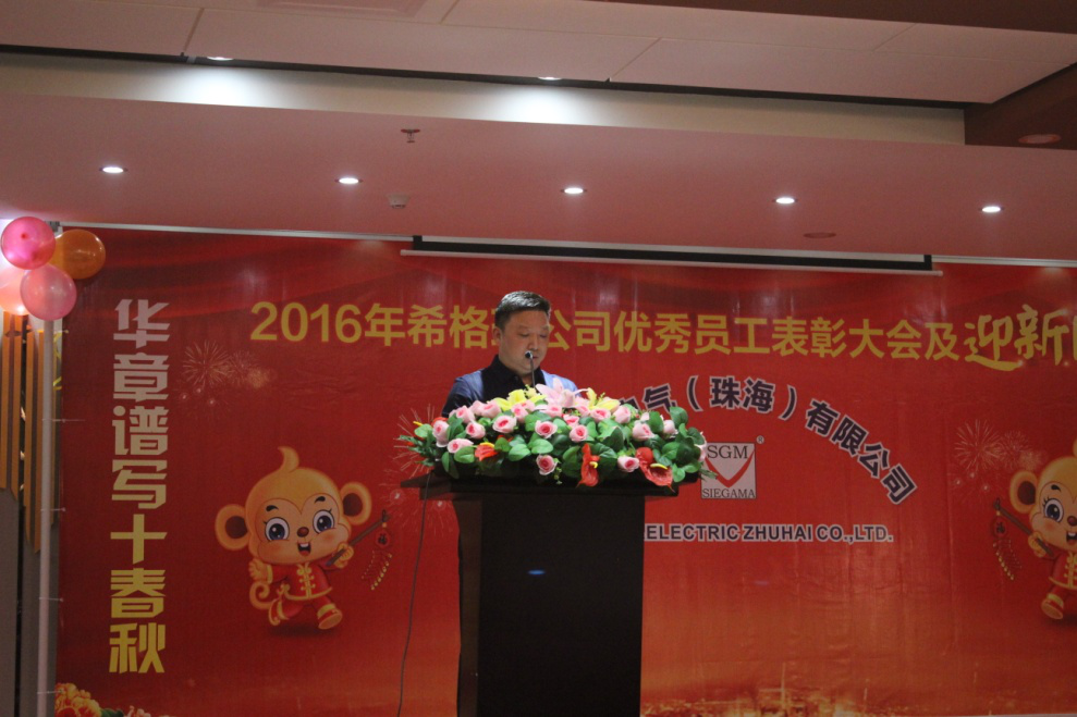 晚上六点十八分年会在欢快的音乐中准时拉开了帷幕,首先,希格玛公司董事长李文勇先生向到场的全体员工、嘉宾朋友致感谢词,感谢全体员工的辛勤付出、以及对希格玛工作给予支持与帮助的合作伙伴致以最诚挚的谢意。李董详细的介绍了希格玛公司2015年的发展历程,他表示:“希格玛公司作为一个在电气行业经营、沉淀了10年的品牌公司。于2015年投入使用自有的全新生产、办公一体化大楼,配套启用先进的办公系统。基于产品质量稳定和质量提升,公司投入资金,进行设备技术改造和生产线升级,同时对旧工艺作了改进和更新换代,对市场反馈的质量问题统筹协调公司相关资源,快速解决质量问题。使希格玛品牌的信赖度和美誉度得到了极大的提升,为营销团队在市场上开拓疆土提供了有力的支撑,公司产品的市场占有率得以稳住,市场份额已恢复回升态势,渠道得到了进一步稳固。2016年公司将继续坚持“以人为本,结合走出去,请进来”的理念,同时将调整战略管理重心,重点从源头抓起,公司自己培养对公司忠诚,实用的复合性人才。加快现代化企业制度建设的步伐,提高技术创新能力,强化营销管理,加强市场数据分析,扩张销售渠道,完善商务管理,落实品牌战略规划,为客户创造更大的让利价值,使客户满意度最大化。使希格玛公司从中获得长远发展和长期利益。”